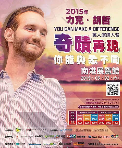 這次 力克.胡哲第三次來臺灣演講,早鳥優惠價只到4/15,千萬別錯過